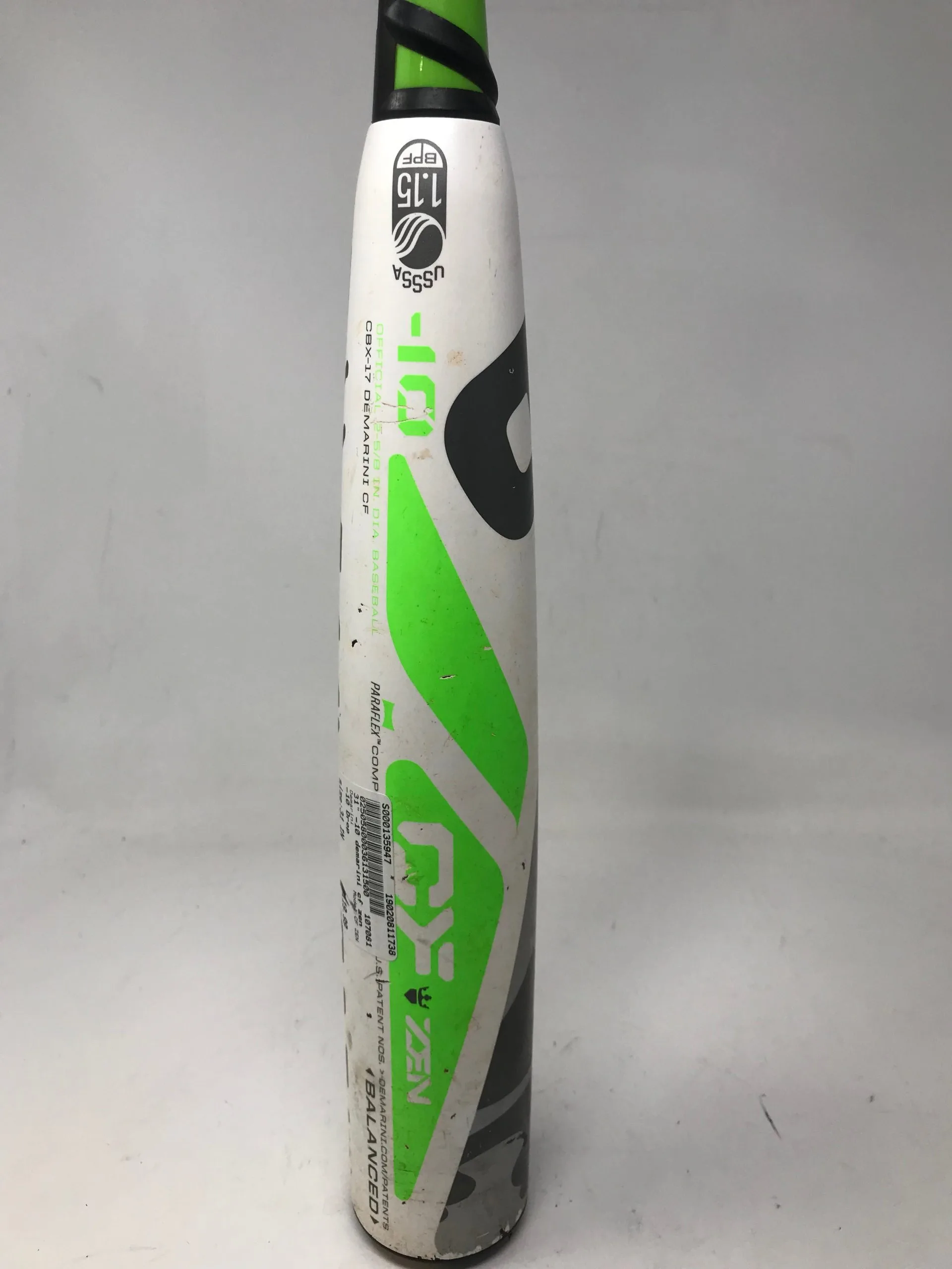 Used DeMarini CFZen CBX-17 Senior League Baseball Bat . The new CF Zen now features an extremely balanced feel to help improve your swing speeds. The CF Zen Senior League Bat has taken on a brand new distinct look . Bat looks brand new no marks on it at all no dents, cracks or rattles. Has “Not for Retail sale” and “No Warranty” written on it